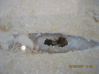 這類修補法是針對孔洞比較小的,或者微裂隙的修補,難度也是最高的一類。這一類孔洞或者裂隙都在1-3毫米,云石膠滲透性不是很好,給修復造成很多麻煩。這種孔洞同樣也會給拋光造成很大的麻煩。